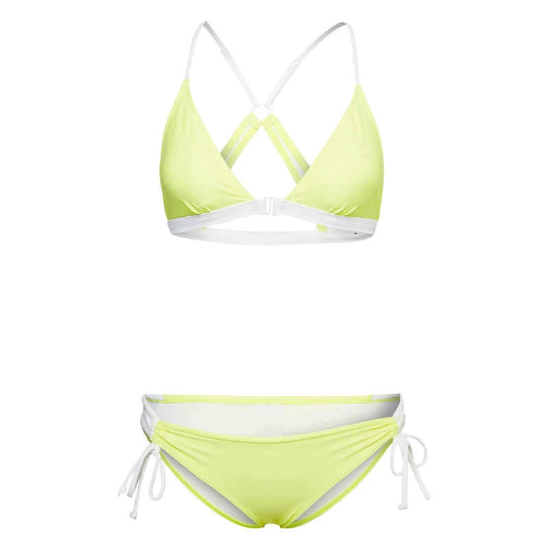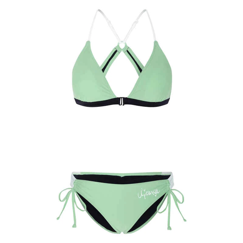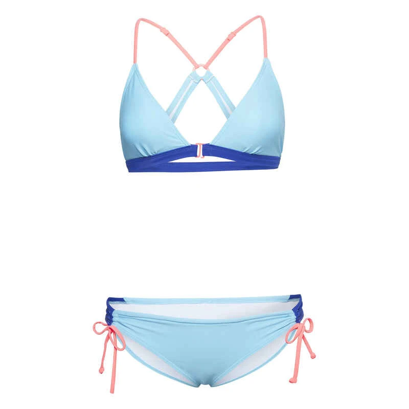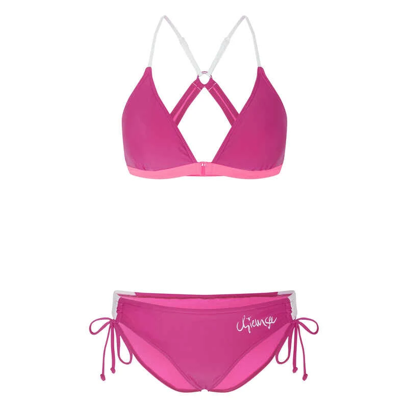 Der sportlich funktionale CHIEMSEE Bikini ist mit seinem coolen Look und gekreuzten Trägern der absolute Hingucker am Strand. Die Hose lässt sich durch einen speziellen Tunnelzug deinem Körper perfekt anpassen und bietet perfekten Halt in jeder Welle. Die hintere Raffnaht weist eine leichte Herzform auf, die einen erstklassigen Knack-Po garantiert. Das Oberteil kommt mit einem unifarbenem Unterbrustband und ist auf der Front zu Schließen.