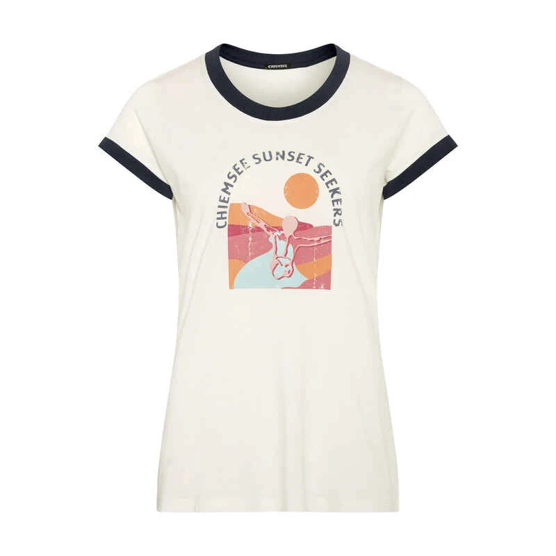 Das retro-inspirierte und locker geschnittene CHIEMSEE Damen-Shirt ist wie geschaffen für modebewusste Sonnenanbeterinnen. Denn vorne zeigt es sich mit „CHIEMSEE SUNSET SEEKER“-Schriftzug und passendem Multicolour-Motiv im coolen Vintage-Look. Erfrischende Kontrast-Akzente setzen die farblich abgesetzten Abschlüsse. Dank Grüner Knopf und Made in Green Zertifizierungen kannst du das T-Shirt von CHIEMSEE mit gutem Gewissen tragen.